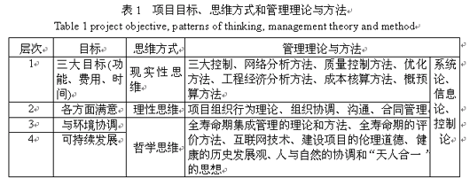 (3)项目目标对项目管理的理论体系和管理方法有决定性作用,则全寿命期目标应有相应的项目管理理论和方法体系(见表1):