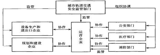国家和地方城市轨道交通安全监管部门: 出台行政法规; 制定行业安全管理政策和安全管理目标; 依法对运营企业、规划建设企业以及设备生产和进出口企业实施安全监管; 向运营企业颁发安全许可, 向设备制造和进出口企业、规划建设企业颁发安全资质证书; 指导运营企业建立内部安全管理体系, 定期对运营企业的安全管理工作进行检查和评估; 负责组织重大事故调查并提供事故调查报告; 负责对公安、消防、医疗等部门的组织协调工作。