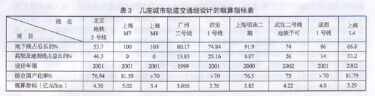 城市轨道交通各类设备在总投资中大约占40%-60%,自国家计委提出的车辆、机电设备国产化率达到70%的要求后,正在建设和筹建轨道交通线的建设单位和设计单位积极支持这项工作。近期几座城市轨道交通线设计的概算指标列如表3。