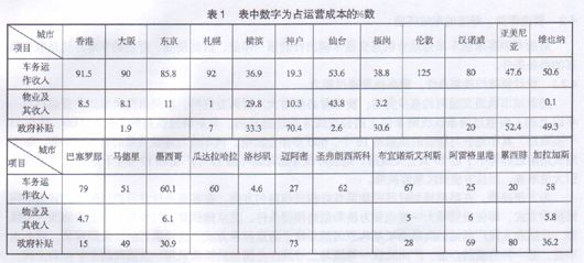 表1中车务运作收入最低的是美国洛杉矶市地铁,只有4.6%,政府补贴最高的是巴西的累酬沛,高达80%,车务运作收人最好的是伦敦和香港,日本的大阪、东京、扎幌在车务运作收入方面也相当好,在90%左右。这些城市的城市轨道交通的经济效益也最好。