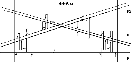 在图2中,R1和R2两条城际轨道交通线路在站点S1换乘,同时和公路B1换乘。通过设定如图所示的换乘线段,可以方便的设定换乘费用,记录统计站点换乘和上下客流。