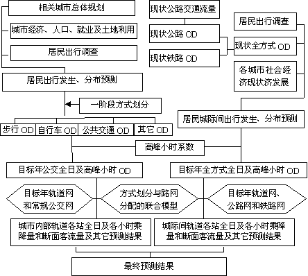 本城际轨道交通客流预测方法从交通需求预测开始,分为城际间客流和城市内客流两条技术路线分别进行预测。城市内客流是指城际轨道交通承担的城市内部的客流。城市内不是以城市的行政区划划分的,而是根据实际情况而定。例如在进行珠江三角洲经济区快速轨道交通一期工程即广佛地铁项目的客流预测时,由于广佛地铁途经的佛山市区和南海市区联连成一片,我们将佛山市区和南海市区一起做为城市内部,其居民出行调查时也是同时进行的。即将广佛地铁承担的佛山市区内部客流、南海市区内部客流以及佛山市区与南海市区的之间的客流都认为是城市内部的客流。本文着重探讨城际间的客运需求预测和城际轨道交通城际间客流的预测方法。