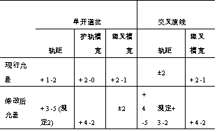 如采用地铁道岔A 、B 值后,当轨距和轮缘槽为标准尺寸时,可计算出单开道岔和交叉渡线钝角辙叉的维修允差,并与现行道岔允差比较见表2 。