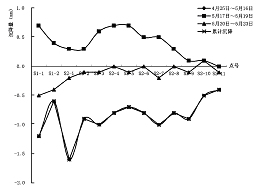 从4 月25 日开始对玄武湖公路隧道底板开始跟踪监测, 到5 月23 日盾构已经完全穿出一段距离后, 公路隧道南北线29 个监测点最大隆沉值为119mm , 最小值011mm , 未影响公路隧道的安全。为分析盾构推进对公路隧道底板影响规律, 分别绘制公路隧道方向(南线) 沉降在不同时间段内的变化曲线图, 以及典型点随时间变化的曲线图(图3 , 图4) 。
