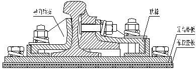 5)设计上在钢轨轨下、铁垫板下均设有弹性垫层,钢轨轨下设置沟槽形式橡胶垫板,理论静刚度约为40kN/mm,铁垫板下设置圆柱粒子形式橡胶垫板,理论静刚度约为60~70kN/mm。这种双层弹性垫层的设置,可以满足城市轨道交通旅客舒适度和一般地段减振降噪的要求。基本轨在与尖轨贴合范围内的轨下不设橡胶垫板,以利于伸缩。