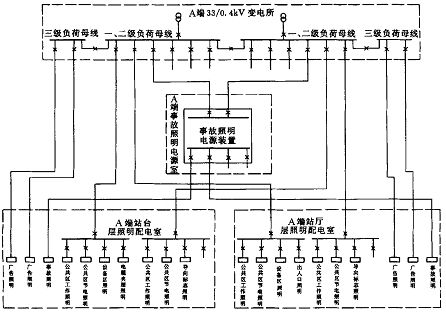 地铁车站通常分地下两层: 站厅层和站台层, 其相应的机电设备通常按车站两端(A 端和B 端) 布置。车站照明分: 设备区照明、公共区工作照明、公共区节电照明、电缆夹层照明、导向标志照明、按负荷等级分: 一级负荷、二级负荷、三级负荷。一级负荷主要有: 事故照明、二类导向标志照明、三类导向标志照明、四类导向标志照明、公共区工作照明、节电照明; 二级负荷主要是设备区域工作照明和一类导向标志照明; 三级负荷主要有广告照明。事故照明电源室的进线电源引自变电所的两段低压母线, 并且采用蓄电池作为备用电源。以一地铁车站内部照明配电为例, 其照明配电系统如图1 所示。