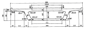 对于预应力混凝土连续梁,在端部张拉预应力钢束时,需要一定的张拉空间,为了保证相邻预应力混凝土梁能同时施工,本次设计预应力梁采用了A 型、B 型以及AB 型3 种梁型。一般区段无碴桥面预应力混凝土连续箱梁横截面为单箱单室截面,梁外轮廓做成了流线形,与流线形的独柱墩协调配合。混凝土采用C50 , 箱梁高1. 5 m , 顶板厚25 cm , 底板厚20 cm , 标准腹板厚40 cm ; 中支点底板厚40 cm , 腹板厚60 cm 。A 型梁端部腹板厚80 cm , 按横向布置2 排OVM15 12 锚具所需最小尺寸确定。由于B 型梁的钢束平弯后在A 型梁的端横梁腹板之间张拉,所以梁端部腹板厚采用150 cm 。全联在端支座及中支座处设4 个横隔板。双线线间距3. 6 m 时, 桥面宽8. 9 m , 标准截面形式见图1 ; 有碴桥面箱梁截面宽为9. 9 m 。