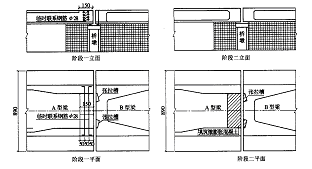 相邻两联连续梁施工必须先施工预应力混凝土连续箱梁,然后再施工与预应力混凝土连续箱梁相邻的钢筋混凝土箱梁,车站结构应在梁部结构施工之后施工。为了保证相邻预应力混凝土梁能同时施工,本次设计预应力梁采用了A 型、B 型以及AB 型3 种梁型。A 型梁必须先施工,为给后施工的B 型梁留出千斤顶张拉空间,A 型梁端横梁腹板之间的混凝土在B 型梁张拉完毕后再浇筑,为了保证A 型梁钢束张拉时腹板的稳定和强度,设横向联系钢筋或横梁钢筋部分不截断,在A 型梁钢束张拉完毕后,为了满足B 型梁千斤顶张拉的空间切断部分钢筋,张拉完一束,再按施工规范要求把截断的钢筋焊接,然后再张拉另一束, 依次张拉(阶段一) 。B 型梁张拉完毕后再浇筑A 型梁未浇筑混凝土(阶段二) 。如果A 型梁的邻跨不需要张拉空间(如钢筋混凝土梁或站房及其他梁型),取消预留槽口。为了满足特殊情况下梁的施工,设计了AB 型梁,该梁型一端同A 型梁,一端同B 型梁,施工方法及顺序与A 型梁和B 型梁相同。详见图2 。载组合产生的内力配筋, 横截面均配置普通钢筋。