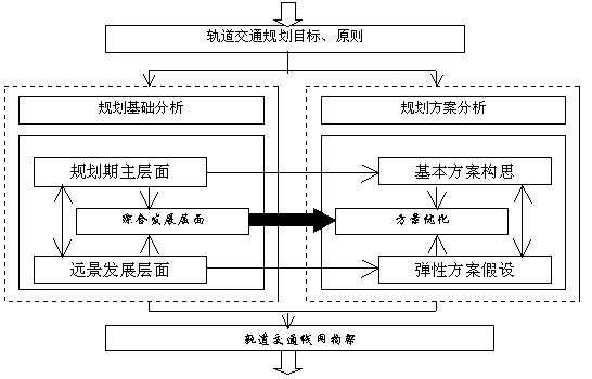 轨道交通线网规划是本次规划研究的核心内容。依据城市发展特点,轨道交通线网规划着重于主骨架的建立。在轨道交通功能定位及既有铁路利用策略指导下,以规划期城市发展目标状态作为规划研究的主层面,构思轨道交通线网构架基本方案。把远景西海域延续扩张模式、东海域充分发展模式作为规划研究的远景发展层面,进行轨道交通线网方案弹性假设和分析。继而在这两个层面基础上进行综合,优化轨道交通线网方案。结合对轨道交通线网的评价分析,对轨道交通线网构架进行不断反馈。