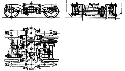 (4) 国内的不锈钢车体制造技术已趋于成熟。长春轨道客车股份有限公司1994 年与韩国合作生产了30 辆时速200 km 的不锈钢客车, 并引进了日本轻量化不锈钢车体生产技术, 已具备了设计和生产不锈钢车辆的能力。2. 4 采用最高运行时速100 km 的转向架目前, 国内城市地铁车辆的最高运行时速为80 km , 尚无最高时速100 km 的转向架。为此, 在选择转向架(图3) 方案时, 采取如下措施来提高转向架运行的安全性、平稳性和稳定性: