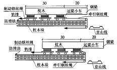 ① 施工准备 在现场拼装钢梁,试装横隔梁,确保各栓接位置满足要求。进行钢梁试移、试吊。② 铺设拖拉梁轨道 在指定位置搭设枕木垛平台,铺设轨排,放置运梁小车,将钢梁吊至运梁小车上, 见图6 。