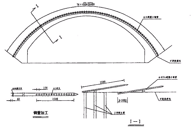 小导管采用<42 , 壁厚为5mm 的无缝钢管,长为3. 5m , 环向间距为40cm , 沿隧道开挖轮廓线,以5°的外插角布置,前后两排小钢管搭接长度不小于110m , 开挖后及时施作锚喷和型钢支撑,并将超前小导管端头焊接在工字钢支撑顶部,以形成整体, 在钢管尾部215m 范围钻<10mm 的注浆花孔,孔距为15cm 。
