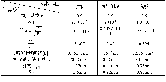 诱导缝间距的大小,直接影响到混凝土结构裂缝出现的大小及多少?如果间距过大,则不能有效地控制混凝土裂缝的有序开展,将失去诱导缝的作用;而诱导缝中裂缝宽度过大,超出裂缝中橡胶止水带允许承受的张拉能力,则会造成结构漏水现象;如果间距过密,则增加施工难度,引起不必要的浪费。所以,诱导缝间距及缝宽的计算,是一个较为复杂的计算,通常在理论计算的基础上,并根据实际施工操作要求两者结合起来确定。