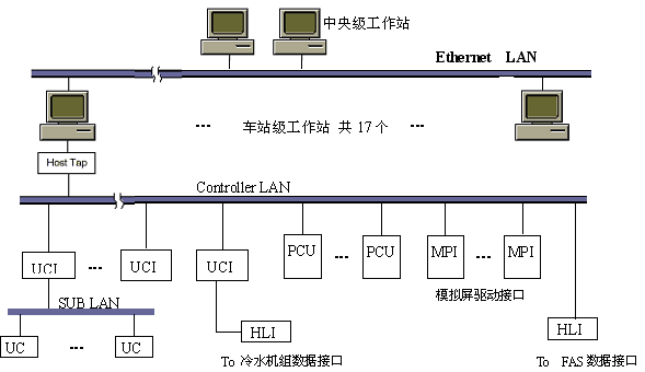 (1) 采用分层局域网(LAN)技术,可实现几点到十万以上点的控制网络,车站间采用以太网(TCP/IP协议)通信,车站级主网(CONTROLLER LAN)采用令牌总线网络通信,子网(SUB LAN)采用轮询(MASTER/SLAVER)方式通信。