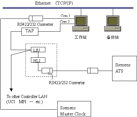 中央级设置工作站及备份站各一套,工作站同备份站实现以太网级别的热备。OCC局域网有与信号ATS及通信主时钟的数据接口及模拟屏一块,网络配置如下: