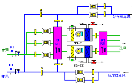 (2) 车站大通风空调系统:BAS系统对空调机、新风机、回排风机及联动风阀和调节风阀等设备进行监视控制,监视风机过载故障报警信号,检测新/排/混/送风及站厅/台温湿度,控制组合风柜出水二通阀开度来调节空调器送风温度,共计DO 44点、DI 72点,AI 30点、AO 4点