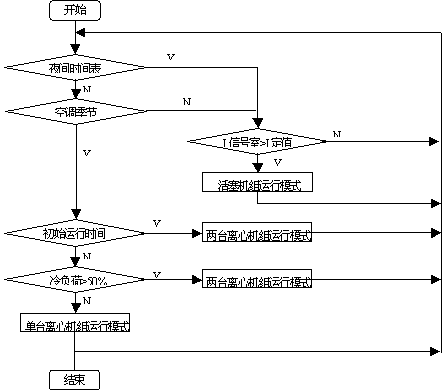 (3) 根据环控要求,车站负荷判定采用水系统分水器温度(冷冻水出水温度)判定,当分水器温度高过某定值开启两台离心机组,低过该值时则仅开一台离心机组,该值采用死区控制,广州地铁一号线初定为7℃~9 ℃。