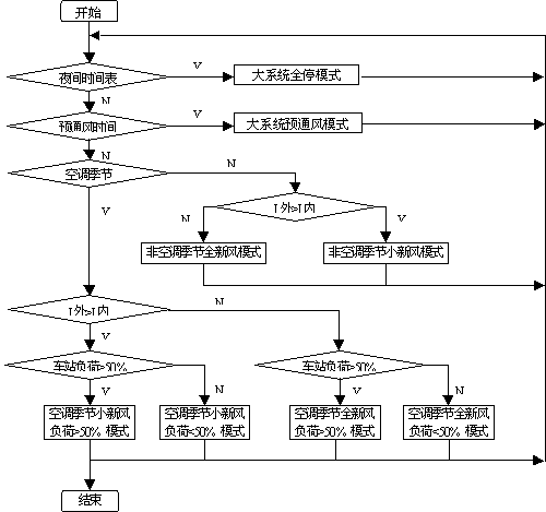 大系统正常工艺模式的自动判定执行主要依据如下条件:①依据室外温度判定大系统执行空调或非空调季节模式②依据车站内外空气焓值的比较判定全新风或小新风模式 ③依据车站负荷情况判定执行负荷大于50%模式或小于50%模式 4)依据时间判定夜间或白天模式。图4为正常运行自动模式判断执行流程。
