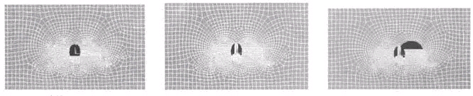 以这种施工方法开挖的主要施工步骤如下(图3) :(a) 中导坑开挖及支护; (b) 施筑中隔墙及支护; 右主洞上台阶开挖及支护; (c) 右主洞下台阶开挖及支护; (d) 左主洞上台阶开挖及支护; (e) 左主洞下台阶开挖及支护。其模拟施工步骤的单元网格划分如图3 所示。