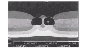 (2) 中隔墙由于是在中导坑稳定过后才浇注的, 故它在下一步施工工序进行之前主要承受的是其自身的重量。本论文两种施工方法这两步工序都完全一样,故它们引起的围岩体位移、应力的变化也完全一样。