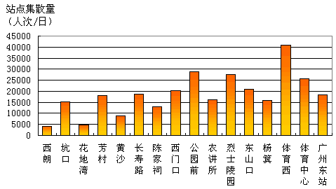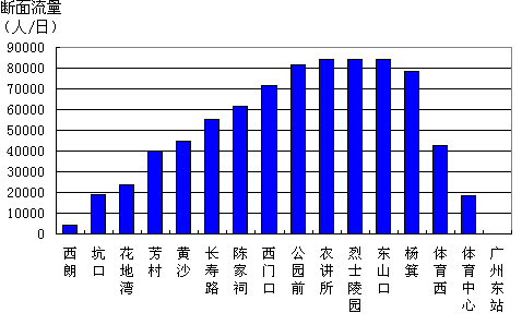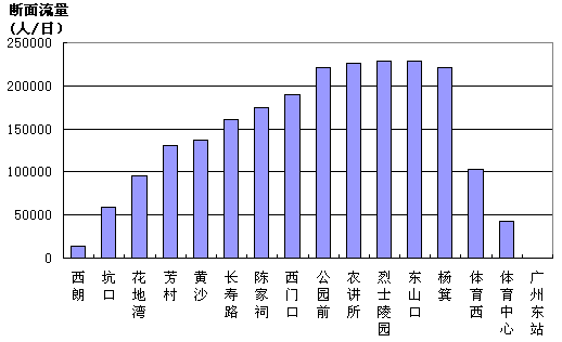 客流集散量最大的站仍然为体育西(平时为4万人次左右,大型节假日更多达13.7万人次),其次是公园前和烈士陵园,此三个站有一个共同之处--周围均有大型商业购物中心。最高流量断面位于公园前至体育西,平时断面双向客流达到8.5万人/日,周末则多达12.5万人次。