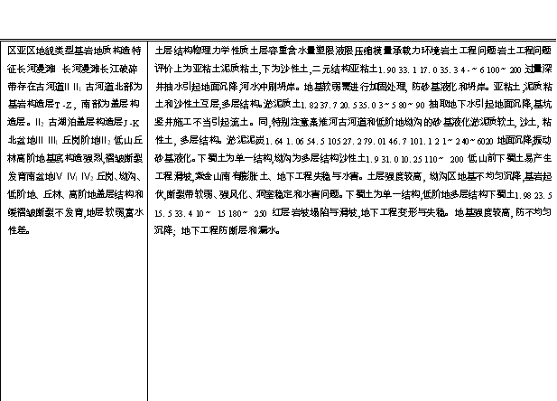 区亚区地貌类型基岩地质构造特征长河漫滩Ⅰ 长河漫滩长江破碎带存在古河道Ⅱ Ⅱ1 古河道北部为基岩构造层T -Z , 南部为盖层构造层。Ⅱ2 古湖泊盖层构造层J -K 北盆地Ⅲ Ⅲ1 丘岗阶地Ⅲ2 低山丘林高阶地基底构造强烈,褶皱断裂发育南盆地Ⅳ Ⅳ1 Ⅳ2 丘岗、坳沟、低阶地、丘林、高阶地盖层结构和缓褶皱断裂不发育,地层软弱,富水性差。 土层结构物理力学性质土层容重含水量塑限液限压缩模量承载力环境岩土工程问题岩土工程问题评价上为亚粘土泥质粘土,下为沙性土,二元结构亚粘土1. 90 33. 1 17. 0 35. 3 4 -~6 100~ 200 过量深井抽水引起地面沉降,河水冲刷坍岸。地基软弱需进行加固处理, 防砂基液化和坍岸。亚粘土,泥质粘土和沙性土互层,多层结构。淤泥质土1. 82 37. 7 20. 5 35. 0 3~5 80~90 抽取地下水引起地面沉降,基坑竖井施工不当引起流土。同,特别注意秦淮河古河道和低阶地坳沟的砂基液化淤泥质软土, 沙土, 粘性土, 多层结构。淤泥泥炭1. 64 1. 06 54. 5 105 27. 2 79. 01 46. 7 101. 1 2 1~2 40~60 20 地面沉降,振动砂基液化。下蜀土为单一结构,坳沟为多层结构沙性土1. 9 31. 0 10. 25 110~ 200 低山前下蜀土易产生工程滑坡,紫金山南有膨胀土、地下工程失稳与水害。土层强度较高, 坳沟区地基不均匀沉降,基岩起伏,断裂带软弱、强风化、洞室稳定和水害问题。下蜀土为单一结构,低阶地多层结构下蜀土1. 98 23. 5 15. 5 33. 4 10~ 15 180~ 250 红层岩坡塌陷与滑坡,地下工程变形与失稳。地基强度较高, 防不均匀沉降; 地下工程防断层和漏水。