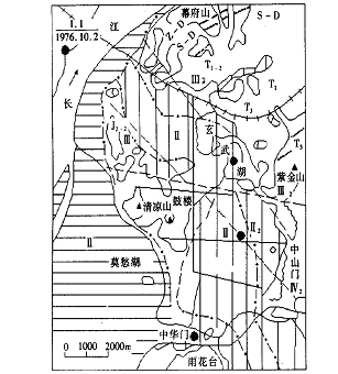 ⑶构造特征:断裂构造规模较大者为鼓楼 定淮门NWW 向断裂,鼓楼 狮子山NW -NNW 向断裂,九华山— 老虎山NW 向断裂和北极阁NN E 向断裂等。