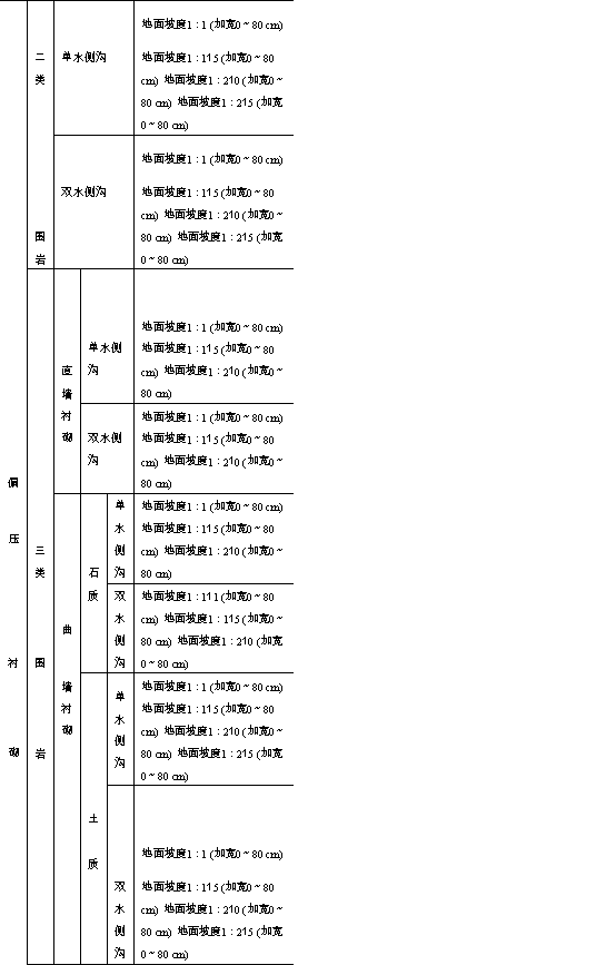 以上给出了隧道洞口及衬砌的分类,与其对应的纵断面图及平面图,在此不一一列举。另外还有洞内水沟形式,截水天沟形式及轨道类型等。