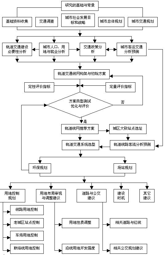 预测城市客运交通未来发展的趋势;确定城市轨道交通线网规划的指导思想与原则;研究论证轨道交通线网的合理规模;以城市总体规划为依据,研究分析城市人口、用地、就业分布特征,以及大型客流集散区和规划客流集散点的空间分布;研究确定轨道交通线网构架与初始方案。