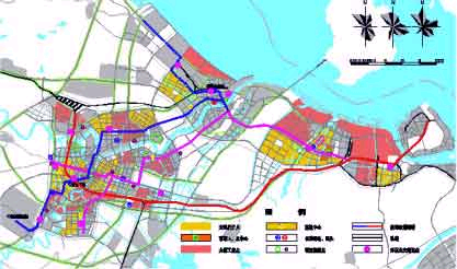 根据城市结构特征和大型客流集散区分布特征,初步形成三种轨道交通线网构架类型,通过优选评价确定为中心三通道放射状,即:从三江片辐射出3条轨道交通通道,第1条直接联系镇海,第2条直接联系北仑,第3条联系镇海、北仑两个组团。