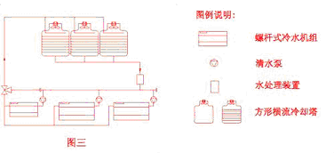 方案三:冷却塔的总冷却能力与冷水机组总冷量相匹配,共用供、回水母管的冷却水循环系统(如图三)。本系统中,三台冷水机组并联设置,容量相同的三台冷却塔串成一组,然后通过共用供、回水母管相连接。