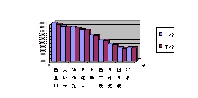 根据初、近、远三期的预测客流量绘制客流断面示意图(详见图4、图5、图6),其中上、下行分别用不同颜色表示,图5、图6将东线的客流示意省略掉。分析客流特征,初步得出以下结论:1. 如此的流量,确实需要轨道交通承担;2.上、下行基本均衡,非明显的钟摆式,便于行车组织,也有益于企业效益;3.西直门站上、下客量过大,初期一站竟占单方向(9座车站)总量的85%,近、远期一站竟占单方向(16座车站)总量的40~44%,显现出强烈的非目的地特征。这在线网优化调整阶段的客流预测中也得到了证明,R8线最大的客流断面在西直门以南。由于列车编组决定了车站的土建规模,因此线路配线的折返能力将是今后该线制约运能的关键。