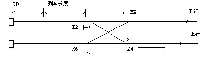 分析本范例的折返间隔时分,主要应考虑的特殊情况为①当前车在进入上行折返线,并出清X8→X6进路中第一个道岔区段以后,可办理X8→X2防护进路,使后续列车提前进站。②当前车在进入下行折返线,并出清X8→X2进路中的第一个道岔区段,至列车在折返线转换运行方向以后等待出发的窗口时间内,可办理X8→ X6的防护进路,使后续列车提前进站。范例D的折返间隔时分由以下几个时间所组成。