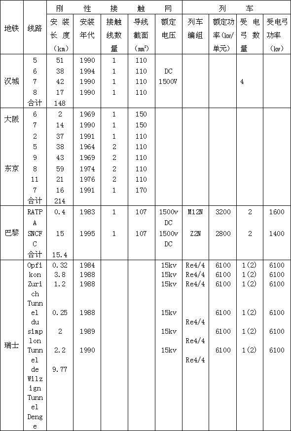 国外应用架空刚性悬挂的情况详见下表: