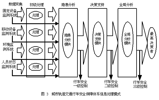 全局分析层从整个城际轨道交通系统安全的角度,结合相关政策法规,分析城际轨道交通系统安全发展趋势,提供决策与效果的相关性分析,形成城际轨道交通行车安全第三级控制,为最高决策提供支持信息。下图为城际轨道交通行车安全信息处理模式(图 3):