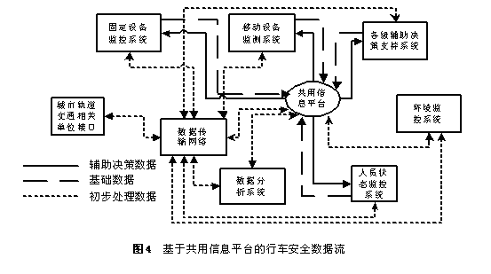 城际轨道交通行车安全保障体系安全信息数据从数据源角度可以划分为:原始采集数据、初步分析数据、辅助决策数据和全局安全数据;从数据性质可以划分为:安全信息数据、一般信息数据、隐患信息数据、危险信息数据和事故数据。城际轨道交通行车安全保障体系各子系统在直接通讯情况下,存在以下问题:在各子系统直接进行数据信息传送的情况下,存在系统共用信息数据缺乏明确的数据维护责任,数据的统一性难以保证,系统接口设计受到其它子系统功能要求的牵制等问题。为此城际轨道交通行车安全保障体系采用共用信息平台的方式进行系统共用信息的管理和维护:城际轨道交通行车安全保障体系共用信息平台担负系统共用信息的中转的职责和任务,各承担信息数据采集的子系统按照一定的系统规则将共用信息发送给共用数据平台,由系统共用信息平台进行规范化处理后加以存储,根据需求规则或各功能子系统的请求,采用规范化格式将数据信息发送出去,采用共用信息平台后的城际轨道行车安全保障体系的数据流如下(图4):