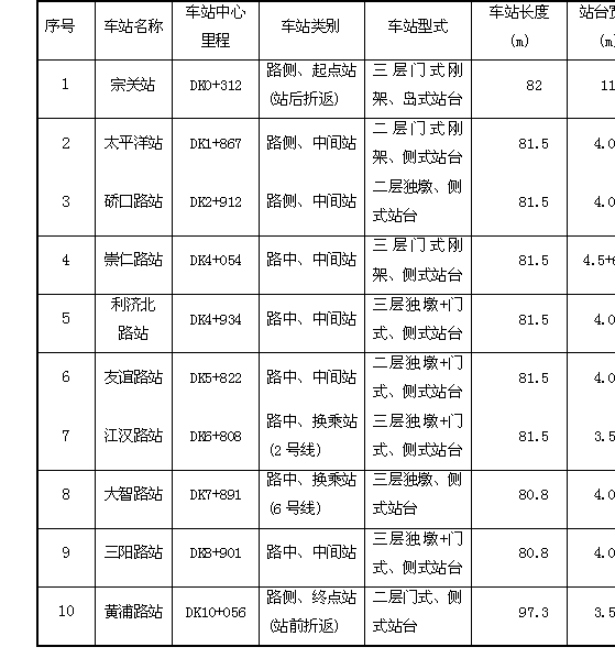 一期工程线路全长10.27km,共设10座车站。最大站间距1555m(宗关站~太平洋站),最小站间距880m (崇仁路站~利济北路站),平均站间距1083m,全部为高架车站。根据车站与道路的相对关系和道路交通状况,设计为7座三层高架站,3座二层高架站,其中宗关站为岛式站台车站,其余均为侧式站台车站(详见表1)。武汉市轨道交通一号线一期工程车站概况表 表1