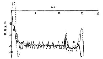 图2 所示的是采用多变量模糊控制对漕宝路站到上海体育馆站这个运行区间进行控制的控制量的变化情况。其中粗实线是多变量模糊控制方法,虚线是一般模糊控制方法,细实线是一般经典的PI 控制。从中看到,PI 控制的控制量的变化最多,幅度也较大;一般模糊控制的控制量变化次数较少,但变化幅度较大一些;而多变量模糊控制则明显优于PI 控制和一般模糊控制。