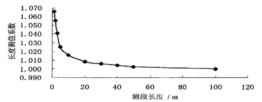 电阻测值精度与测段长度有一定的关系,测段越长,测得的电阻值精度越高。测量分析结果如图2 所示。长度测值系数=(平均测值/ 本测段长度)/ (100 m 测段平均测值/ 100)