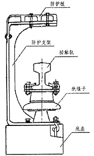 三轨安装在绝缘子组件上(见图4) ,由接触轨、绝缘子、三轨夹板、防护支架、防护板、端部三轨弯头、防爬器等构件组成。受流器滑靴从上压向接触轨轨头顶面受流。受流器的接触力是由下作用弹簧的压力调节的,受流平稳,由于端部弯头的过渡作用,能够减少在断电区的电流冲击。