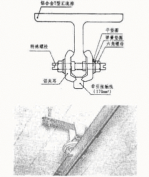 刚性悬挂又称刚性接触网,是一种区别于传统柔性接触网的供电方式。由于地铁隧道供电导线上方空间有限,链形悬挂一般采用冷拉电解铜接触线。1962 年日本东京营团地铁日比谷线开通时, 考虑可能发生断线事故而要有保护措施、洞内维修作业较复杂等问题,以及隧道断面比三轨供电要大幅扩大的情况,开发了地铁用的新的刚性悬挂方式。现在通过10 多个国家、30 多条地铁的运营, 经过不断改进设计,刚性接触网系统已日臻完善, 非常可靠。如营团地铁南北线使用的刚体悬挂(见图3) :采用铝合金T 型汇流排和铝夹耳来夹持铜导线,设计简单,施工容易; T 型汇流排截流截面大,减少电阻40 % 以上,无须辅助馈电线,使得其结构简单紧凑,节省隧道净空,节省投资;导电铜线不受张力,应用可靠,耐磨性好;接触网系统零部件少,大大降低了维护成本。
