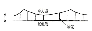 简单悬挂方式结构简单,支柱高度低,支持装置承受的负荷较轻,但是弛度大、弹性不均匀。为改善这一状况,一般在悬挂点处增加一个倒Y 形的弹性吊索,称为弹性简单悬挂(见图1) ,相应改善了悬挂点处的弹性和运行状况。由于弹性简单悬挂建造费用低,施工方便维修简单,城市电车或轻轨往往采用这种悬挂方式。地铁为了减少隧道净空,采用以弹性支座或弓形腕臂作支持部件的简单弹性悬挂。