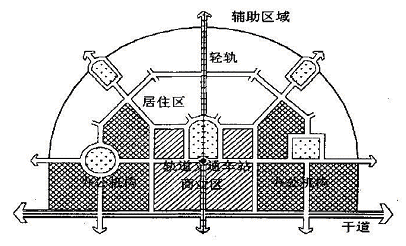 西方发达国家在这方面已进行成功实践, 美国、日本专家已提出“面向轨道交通的土地开发” 新思想, 希望通过轨道交通站点附近土地的高强度混合开发, 控制城市蔓延趋势, 削减小汽车使用, 期盼回归到城市布局紧凑及以自行车、步行为主导的非机动化城市交通模式(图1) 。