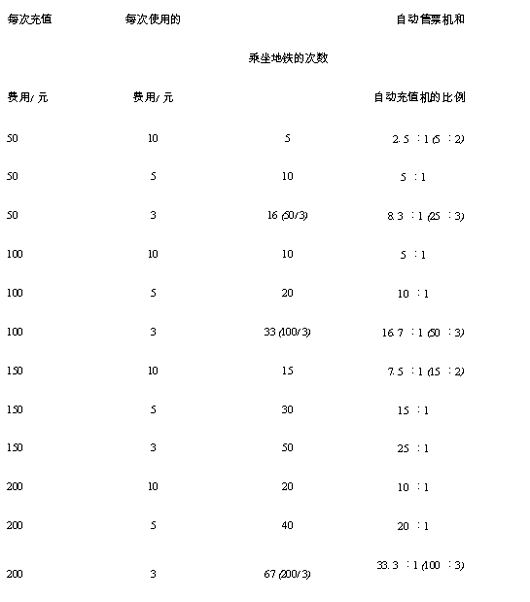 假设自动售票机的处理速度为10 人/ min , 自动充值机的处理速度为5 人/ min ,票务处理机(在地铁车站中,票务处理机可以卖单程票和储值票, 也可以给储值票充值) 对自动售票机和自动充值机的影响程度相同。此处假定影响程度为零,即票务处理机不工作,进地铁的高峰客流中有一半人用储值票。如果自动售票机和自动充值机在相同的时间内服务完各自的乘客,使用储值票的人每次充值50 元,能用5 次,那么自动售票机和自动充值机的比例为2. 5 ∶1 。计算结果如下表: