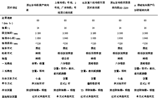 2. 2 国内既有转向架的特点目前, 国内地铁、轻轨电动客车用转向架除国产的外, 还有引进国外技术的, 主要有2 种: 一种是上海地铁1 号线、2 号线和广州地铁1 号线用转向架, 为从欧洲整机进口的产品; 另一种是北京复八线地铁用转向架, 为引进韩国韩进重工技术研制生产的产品。其中, 上海2 号线地铁车辆也用于我国第一条高架轻轨—— 明珠线。为便于分析比较, 将各种转向架的主要技术特征和参数列于表1。