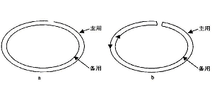 图1 是逻辑上的业务流程示意图。在物理上为了保证传输系统的安全可靠,须采取环形组网的方案,以利于自动保护的需要。这样,控制中心连同所有的车站和车场组成一个自愈环,即使某段光纤坏掉,也可保证业务在备用通道上正常进行。其实现机制如图2 。图中,传输环一般有两个光纤环组成,当一个环中断时,系统自动跳到另一个环上, 即图a 情形;而当两个环在同一个地方断开时,则两侧的节点自动打环,形成如图b 的通路。