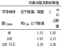 基于如上原因,各国在考虑双导体的风载体型系数方面有所不同。我国《66 kV 及以下架空电力线路设计规范》(GB 50061-97 )第7.1.2 条中规定的风载体型系数:d<17 mm 时取值为1.2; d≥ 17 mm 时取值为1.1;覆冰时取值为1.2。对分裂导线,不应考虑线间的屏蔽影响。德国接触网双导线计算风载时,按每根单导线的风载乘以导线的根数进行计算。前苏联则规定了支柱位于路面、路堑和5 m 以上路堤情况下的双线风载体型系数的不同取值,见表1。
