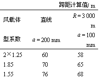 我国计算链形悬挂风偏采用了当量系数法,而前苏联和德国则都采用了加入吊弦作用后的风载计算法。研究和计算表明,在接触线张力和拉出值确定后,接触网的允许最大跨距随风载的增加而减小。现将采用单导线风载体型系数乘以导线根数的城轨交通接触网双导线风载体型系数的选用计算法与前苏联风载体型系数算法进行比较,当最大允许风偏为375 mm 时,最大允许的计算跨距如表2 所列。