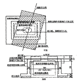 设计采用的防护方案是:凿除井顶圬工,在既有电缆井外加设钢筋混凝土套箱,套箱顶板开设圆形人孔, 孔中心对准线路中心,上置开孔的钢筋混凝土整体道口板,加盖板,以利检修。