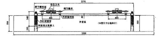 轨排支撑架是轨排架设和状态调整的基础, 普通道床地段的轨排支撑架主要由横梁、螺柱支腿(可调整高度)、承轨槽(设轨底坡可左右滑动)、承轨槽两端调整螺栓等几部分组成。浮置板轨道轨排支承架的设计思路主要为: 沿轨排纵向均匀分布, 其间距在保证有足够的强度和刚度前提下确定。横粱的高度要充分考虑轨下净空, 并考虑拆除承轨槽用4 mm 垫板设置轨底坡来增加横梁高度。同时, 考虑到在横粱下混凝土内留槽和拆除钢轨的方式来拆除轨排支撑架。轨排支撑架的长度若超出轨道板宽度将会对侧模高度产生影响, 可考虑将横梁设计成V 字型来避免, 但需特殊加工。推荐使用普通道床用的长2 270 mm 轨排支撑架, 将螺柱支腿套入硬塑管(壁厚5 mm 左右) 埋置在混凝土内, 若支腿高度不够可在硬塑管底预制混凝土柱, 并将调整螺栓加高后设置在轨腰处。轨排支撑架设计如图2 所示。轨排架设到位后, 依据基标利用直角道尺调整轨道状态, 并精调到位。